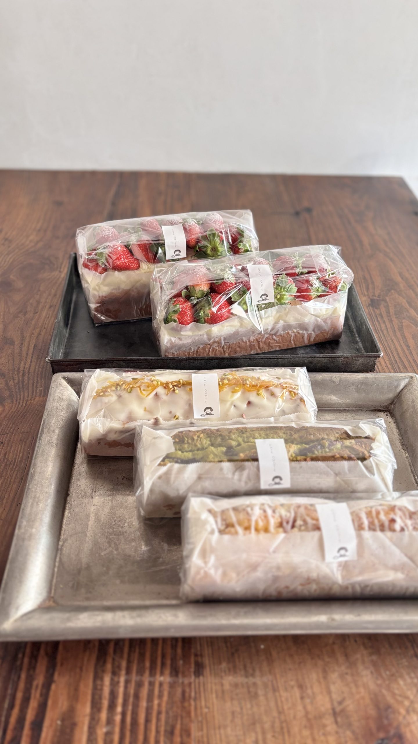 パウンドケイクのお値段は材料の値段によって異なりますが、2000円~2300円(税込み)、苺とフロスティングたっぷりのパウンドケイクは約3000円(税込み)となります。お問い合わせは、カフェヲモテのインスタグラムより、DMやお電話にておまちしております。